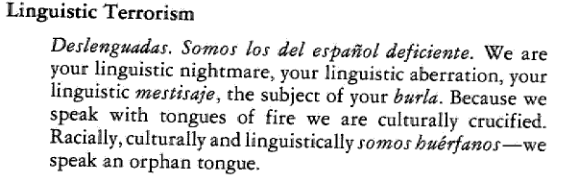 “A border is a dividing line, a narrow strip along a steep edge. A borderland is a vague and undetermined place created by the emotional residue of an unnatural boundary. It is in a constant state of transition. The prohibited and forbidden are its inhabitants.”